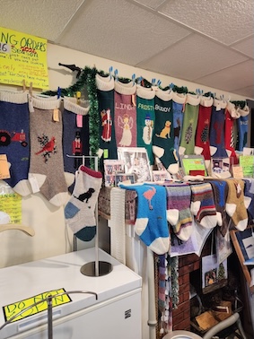 Linda’s biggest seller is her custom-knit Christmas stocking. She started making them in 1989 and has sold 3,087 to date. Each stocking takes a day and a half for Linda to knit. Her most unusual stocking is one of the space shuttle that was commissioned for an astronaut in Dallas, Texas. She is booked through the first week of April in 2026.